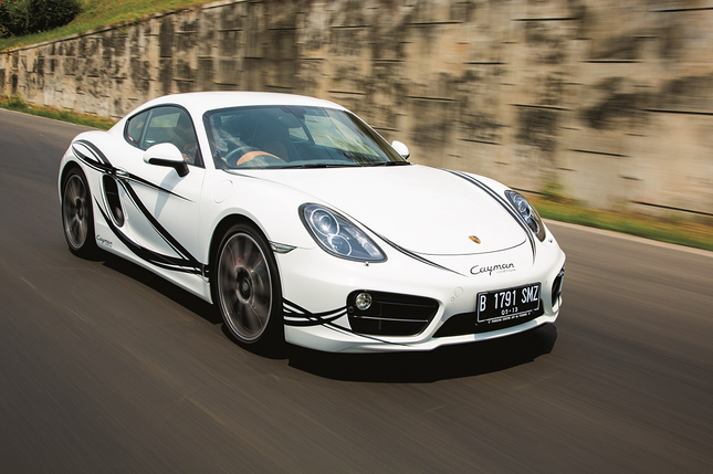 Lupakan bodinya yang dihiasi ‘striping’ model Tribal. Ini adalah hasil karya desainer grafis asal Surabaya, yang karyanya memenangkan lomba desain yang diadakan oleh Porsche Indonesia. Meski sebetulnya Kami lebih menyukai mobil ini dalam keadaan polos, tapi sudahlah, toh paras Cayman masih tetap cantik. Dari depan Anda akan langsung tahu bahwa ini adalah Porsche, meski karena desainnya mirip-mirip dengan saudara-saudaranya yang lain (911 dan Boxster), Anda harus melihat dari samping untuk bisa memastikan ini adalah sebuah Cayman.